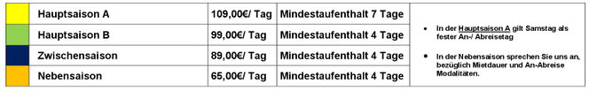 Bei der Buchung müssen 20% des Mietpreises beglichen werden, spätestens 3 Wochen vor Anreise bitten wir Sie, den